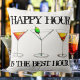 Design features an original marker illustration of a row of classic cocktails (martini, cosmopolitan, Manhattan) with HAPPY HOUR IS THE BEST HOUR in a fun font.