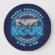 Happy hour neon sign style text, in blue and white with customizable white text for time and day.