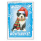 Send Christmas greetings with this card of a cute Bearded Collie puppy wearing a Santa hat and striped scarf amid snowflakes and the words, Happy Howlidays! Great for Beardie-loving family and friends. Have a Happy Howliday!
