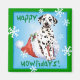 Celebrate the holiday season with a cute Dalmatian puppy sitting in a Santa hat amid snowflakes and the words, Happy Howlidays! Great holiday gift idea for Dal-loving family and friends.