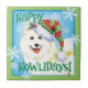 Celebrate the holidays with a happy Samoyed wearing a striped stocking cap amid a flurry of snowflakes and the words, Happy Howlidays! Great holiday gift idea for Sammie-loving family and friends.