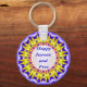 Key Chain with circular mandala design and text Happy Joyous and Free. You can customize it by adding your own text It is artistically created.