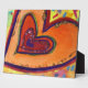 A small purple heart is enclosed by a red heart that is within orange hearts. The hearts are outlined in green, purple, and red. The watercolor background is a soft yellow with colourful confetti dots. A light layer of gold and red glitter traces the heart edges. Painting detail from Inspirational Word "Happy" artwork.