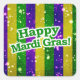 Mardi gras motif poster design with letters against striped background in vivid blue, green and yellow colours