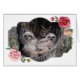 A sweet image of a great horned owl mom with her nestlings. Set off by a flowered border.