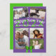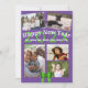 Flat, Happy New Year greeting cards with five photo templates. Purple and green design on 5x7 inch cards, with two lines of custom text. The new year numbers are green and match the bow between the photos at the bottom. Upload four horizontal / landscape photos and one portrait. Reverse is solid green.