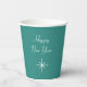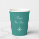 Happy New Year teal green and white paper cup, with a snowflake design and customizable typography lettering. A trendy and festive addition to your New Year's party or winter celebration.