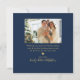 Elegant Happy New Year hand written Script Minimalist Navy Blue and Gold 4 Photo Collage Holiday Card. This festive, minimalist, four (4) photo holiday card template features a pretty photo collage and says „Happy New Year”! The greeting text is written in a beautiful hand lettered swirly swash-tail Calligraphy font type in gold on deep navy blue color background. On the reverse side with greeting text template, a little heart doodle and one horizontal photo template. Lovely greeting card for your family and friends in winter Holiday season.