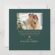 Elegant Happy New Year hand written Script Minimalist Green and Gold 4 Photo Collage Holiday Card. This festive, minimalist, four (4) photo holiday card template features a pretty photo collage and says „Happy New Year”! The greeting text is written in a beautiful hand lettered swirly swash-tail Calligraphy font type in gold on dusty green color background. On the reverse side with greeting text template, a little heart doodle and one horizontal photo template. Lovely greeting card for your family and friends in winter Holiday season.