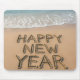 The words "Happy New Year" are beautifully etched into the sand of a pristine beach, as gentle waves caress the shoreline