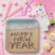 The words "Happy New Year" are beautifully etched into the sand of a pristine beach, as gentle waves caress the shoreline