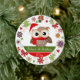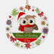The owl is in shades of beige and chocolate brown with a red santa hat and scarf. The various ornaments in red, orange, lime, purple are in the background. The texts and owl are customizable. The back of the ornament is have the same background image and the texts are customizable as well.