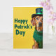 This greeting card shows a reddish-brown dachshund on the right side, looking straight out with a gentle, affectionate gaze that feels like it’s meant for a close friend. It wears a black top hat with an emerald green band and a neat four-leaf clover pinned to the front ☘️. A thick forest-green turtleneck sweater wraps its long neck and chest, with ribbed knit texture you can almost feel. The left half of the design is filled with a bright, sunlit yellow field that makes the dog’s warm fur and green clothing stand out 💚. Across that yellow area, the words “Happy Patrick’s Day” are set in dark green lettering, placed to the left of the dog for balance. Soft, even lighting highlights the shiny nose, bright eyes, and the folds of the sweater, giving the portrait a cozy, close-to-you feel. The yellow background stays plain and open, while the hat’s green band and clover add small, crisp details near the top right.