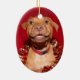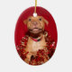 Red nose pitbull puppy full of Christmas cheer eagerly awaits Santa but meanwhile contents himself with playing with the Christmas decorations all happy and with a typical pitbull terrier smile dog lovers Christmas holiday ornament