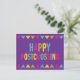 Happy Postcrossing message for postcard lovers is in very bright colours typographic design with colourful banners across the top and bottom and a bright purple background. Happy mail!