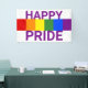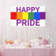 Celebrate LGBTQ Pride with a rainbow flag strip with the words HAPPY PRIDE in bold purple typography above and below it on a white background. Red, orange, yellow, green, blue, and violet colour blocks go from left to right across the centre.