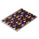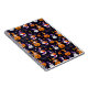 A Halloween theme pattern with several pumpkins with happy carved faces carved in them. The pattern was generated by A. I. and has a black background. You can have this repeating pattern printed on any product that is suitable for all-over printing and can be associated with Halloween.