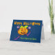 Your Son will giggle when he sees this delightfully happy pumpkin dancing across a Happy Halloween greeting in his violet dancing shoes, gloves and striped leggings? Text may be personalized in template provided. Adding your Son's name would make this a very special card.