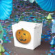 A fun way to hand out your Halloween treats with a happy Jack-o-Lantern pumpkin on a black background "take out" box.