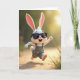 This card features an anthropomorphic white bunny 🐰 bounding along a sunlit path, its tall ears lined in pink and its smooth coat catching the warm light. Dark-lensed glasses sit on its face, and the wide, open-mouthed smile reads like it’s racing toward a friend with an eager, affectionate grin. It wears gray overalls dotted with small white spots, adding a cozy, youthful look as its arms stretch outward for an almost-hug in motion. The background is softly blurred with golden-hour glow, mixing gentle greens and shimmering light circles that feel like a quiet park or garden edge. A short greeting appears near the top in a soft pastel tone, with smaller supporting words placed beneath it in a lighter shade for contrast. The bunny’s lifted foot and forward-leaning posture suggest a carefree dash, like a sweet run to meet someone special 🌷. Behind it, the sandy ground fades into warm highlights while the green backdrop melts into bokeh specks and honey-colored haze.