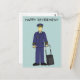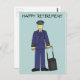 A cartoon pilot, standing with a small black suitcase on wheels, against a taupe coloured background with the words 'Happy Retirement' above the image.