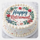 A cheerful Happy Retirement sticker designed like a decorated celebration cake, featuring bold blue and red lettering, colorful bows, red flowers, and gold accents. Perfect for gift bags, party favors, cards, and retirement décor.