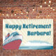 Happy Retirement party banner with a vintage cruise ship illustration. Edit the name to personalize for your retiree being honoured. Sun rays on ocean background. Great for cruise lovers!