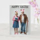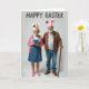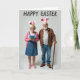 Designed with a light grey background, this card features an elderly couple standing close together, sharing an easy, affectionate grin. Both wear white headbands with pink-lined bunny ears 🐰, and the woman’s has small yellow and pink flowers tucked near the base for a sweet touch. She has neatly styled silver hair and glasses, smiling as she holds a bright blue smartphone in front of her chest, as if capturing the moment. Her outfit includes a denim overall dress, a soft pink cardigan, and pink flats with tiny blossom details, adding gentle color against the simple setting 🌷. Beside her, the man has a trimmed white beard and glasses, dressed in a brown jacket over a striped henley with blue jeans, leaning lightly on a polished wooden walking stick. Across the top, a seasonal greeting appears in thick, hand-drawn lettering, set in a dark tone that stands out clearly against the pale background. Soft, diffused lighting highlights their faces and the textures of the denim, knit cardigan, and wooden cane, with the bunny ears angled slightly outward above their heads.