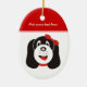 Happy silly puppy custom ornament, featuring a silly puppy with red bow on it’s head.