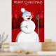 Cute Christmas poster with an illustration of a happy snowman singing with a microphone on bright red background and the text "Merry Christmas". Snow is falling, snowflakes everywhere, and a forest of pine trees can be seen in the background.