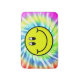 This bath mat features a cheerful smiling face emoji set against a colorful tie-dye background with soft, blended rainbow hues. The playful design combines bright color and lighthearted style for a fun, expressive look.