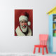 A smiling Santa Claus with red cheeks, white beard and his classic hats and clothes on a red background.  This is a AI generated art.