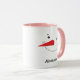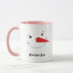 Cute holiday coffee / hot cocoa mug features a happy winter snowman face with warm rosy cheeks, carrot nose, eyes and smile made of coal. Snow white, black, pink and orange design colors. Personalize with a name or other custom text.