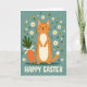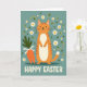 This card features a tall, stylized ginger cat standing upright in the center, with warm orange stripes, a creamy belly, and a gentle smile that feels like a friendly hello. Its rounded face and soft whiskers give it a tender, companionable look, as if it’s posing for someone it cares about. On the left sits a bundle of orange root vegetables with leafy green tops, tied neatly with a white bow, adding a sweet, shareable touch 🐰. The background is a muted teal, sprinkled with small white daisy-like flowers with golden centers, plus scattered green leaves and a few curled yellow accents that suggest a light breeze 🌷. Along the bottom edge, a short Easter greeting is set in light-colored lettering that stands out clearly against the teal. The illustration uses simple shapes and smooth, flat color areas, keeping the scene airy and easy to take in. White blossoms and tiny green sprigs drift across the teal field around the cat and vegetables, with yellow curls looping between them.
