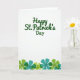 This card features the words “Happy St. Patrick’s Day” placed in the upper third, centered and written in deep green, with smooth, flowing lettering that feels like it’s meant for someone you’re close to. The background stays bright white, giving the message plenty of space and making the green stand out 💚. Along the bottom edge, a border of stylized, multi-petaled flowers spreads across the width like a garden row, hinting at a shared stroll or a quiet moment side by side. The blossoms shift through greens from light lime to emerald, mixed with cooler teal tones, creating a fresh St. Patrick’s Day look ☘️. Many petals are slightly see-through, so where they overlap you can see darker and lighter areas forming new shades. The layered shapes add depth and a gentle sense of motion, as if the flowers are leaning toward each other in a soft spring breeze. The text remains the only lettering on the front, with no extra lines, sitting above the floral border on the open white space. The bottom band is filled with overlapping translucent flowers in lime, teal, and emerald, their rounded petals forming a neat horizontal garden strip.