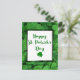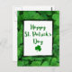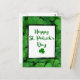 A postcard with a Happy St. Patrick's Day design written in a trendy green font. A green clover underneath the text. The background is a field of forest green clovers.