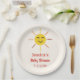 This is custom personalized gender neutral baby shower paper plate featuring smiling happy cartoon Yellow sun with a little ray of sunshine theme. you can change the name and date on the design using persnalize template