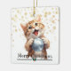 On this cute Holiday ornament, an adorable little ginger tabby kitten holds a stolen silver tree bulb. The text at the bottom front says "Merry Christmas". A gold snowflake background pattern adds interest to the design. The same image is on the back, but the text that says "Happy New Year" is a custom text field that you may easily change to a name or a signature, if you'd like.
