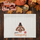 Celebrate Thanksgiving with this adorable pilgrim turkey kitchen towel that's wishing everyone a "Happy Thanksgiving" on a faux linen background.