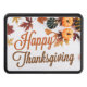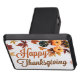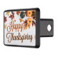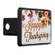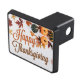 This beautiful Happy Thanksgiving trailer hitch cover features a pretty autumn leaf border of brown and orange leaves with orange pumpkins in lovely fall colours for the holiday. Cute seasonal car decor.