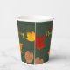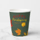 Personalized Thanksgiving paper cup design featuring the text "Happy Thanksgiving" written on a green wood background with colourful foliage. The text is fully customizable. To change it use the Personalize option. For more changes, such as changes to the font, font colour or text layout, use the Edit design tool option.