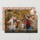 This modern minimal photo Thanksgiving card offers a horizontal photo that fills the front of the card. The greeting "Happy Thanksgiving" appears in white on top of the photo, highlighting the word "happy" in modern elegant script. The back of the card offers space for another photo, custom text for a personal message, and is accented is a cozy autumn plaid border.