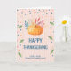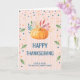 A folded holiday card with a striped background in pink and gold. An orange watercolor pumpkin with colourful leaves.