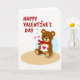 This Valentine's Day card shows a brown teddy bear sitting on a sandy-tan oval near the lower right, smiling with big black eyes. The bear wears a red scarf and holds a small white card with a bright pink heart on it, like it’s offering a sweet note. Behind the bear, there’s a light blue, cloud-shaped area that makes the scene feel soft and calm. In the upper left, the words “HAPPY VALENTINE’S DAY” appear in red letters, and the apostrophe is a tiny red heart. A few small pink hearts float upward nearby, adding a gentle romantic touch 💘. The white background keeps everything simple and easy to notice, with the reds, pinks, and blues standing out clearly. It’s a warm, friendly design that feels perfect for love, kindness, or close friendship ❤️😘.