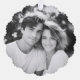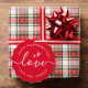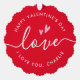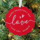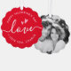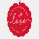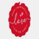 Ornament card featuring the text "love" in an elegant script font with two cute, pink hearts above. Customizable name and text "Happy Valentine's Day". Red or custom colour background. Add a custom photo on the back.