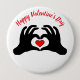 Celebrate the season of love with this striking and modern Valentine's Day pin button. The design features a bold black silhouette of two hands coming together to form a heart shape, framing a vibrant red heart in the center.