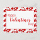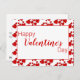 This Valentine's Day postcard is red and white. 'Happy Valentine's Day' is in red text on the front. The border has a pattern of red hearts. The back has two lines of black display text. You can edit it to show a personalized message and your name.