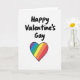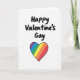 This greeting card features the message “Happy Valentine’s Gay” in thick, hand-lettered black script across the top center. The letters look loose and handwritten, with a friendly, casual flow that feels personal. Under the text sits a large heart outlined in black, drawn with slightly uneven lines that give it a handmade look. Inside the heart are horizontal rainbow stripes in purple, blue, green, yellow, orange, and red, standing out clearly against the white background. The simple white setting keeps all the attention on the message and the pride heart, tying the design to love, acceptance, and friendship. Overall, it feels upbeat and welcoming, like a direct note of support you’d be happy to give or receive ❤️💌.