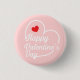 This fun Valentine's Day pinback button design features white script text of Happy Valentine's Day decorated with a heart shaped swash. Pink background is optional and can be changed to any colour.