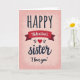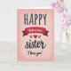 This Valentine's Day card shows a soft blush-pink background with a light, watercolor-like texture that feels gentle and cozy. The message is stacked in the center, with “HAPPY” at the top and “sister” near the bottom in dark blue, simple sans-serif letters. Across the middle, a red ribbon banner stretches from side to side, and “Valentine’s” appears on it in smooth white cursive lettering. Beneath the banner, a bright red heart sits in the center with small red lines around it, like little rays showing excitement and love. Under “sister,” the words “I love you,” are written in a smaller, handwritten-style line, making it feel extra sincere. The pink, red, and deep blue colors work together to keep the message warm and easy to read ❤️. It’s a sweet way to remind your sister she’s loved and appreciated, and it makes sharing Valentine’s Day sentiments feel simple and true 🥰.